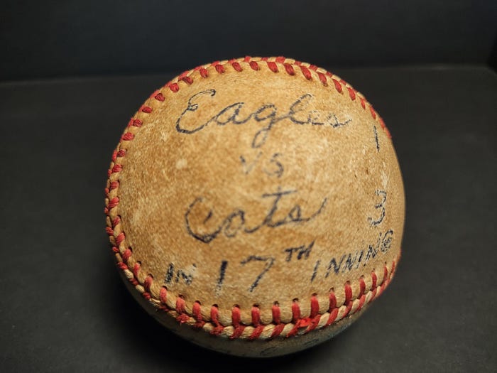 The origin of this article occurred while I wandered through the “world’s largest flea market” in Canton, Texas. I came across an old baseball lying among other vintage items. Looking closer, I noticed written on the weathered ball, “Eagles 1 vs Cats 3 in 17th inning” and “April 29, 1955.” This discovery inspired me to research and write about the game.