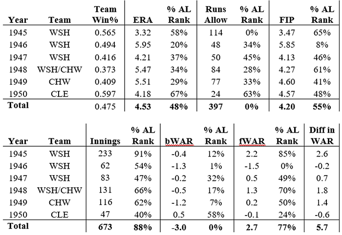 For 1945–1950, his bWAR was the lowest of the 304 pitchers in the AL, and he allowed the most runs. Even in his rookie season, despite 14 wins, his bWAR was in the bottom 12% of AL pitchers.