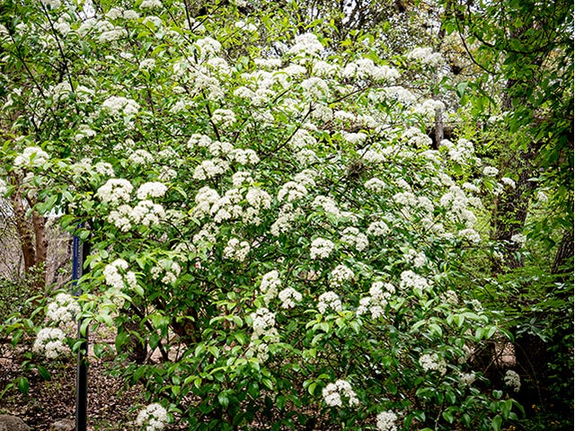 A Rusty Blackhaw tree provides beauty in all seasons. It combines attractive leaves, abundant white flowers, colorful fall foliage, and an interesting form in winter.