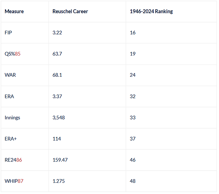 Reuschel concluded his career with a 214–191 record, placing him 48th in wins over 1946–2024 and 94th all-time. The table below summarizes his significant career metrics and ranking among the 64 pitchers with over 200 wins between 1946 and 2024.